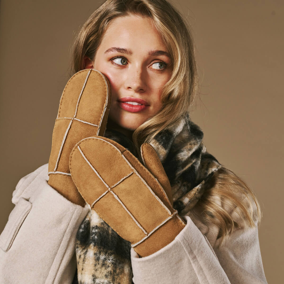 Zeitloses Design: Mit ihrer schlichten Patchwork-Konstruktion und der natürlichen Kamelfarbe verbinden diese Handschuhe Langlebigkeit mit einem klassischen Winterlook.