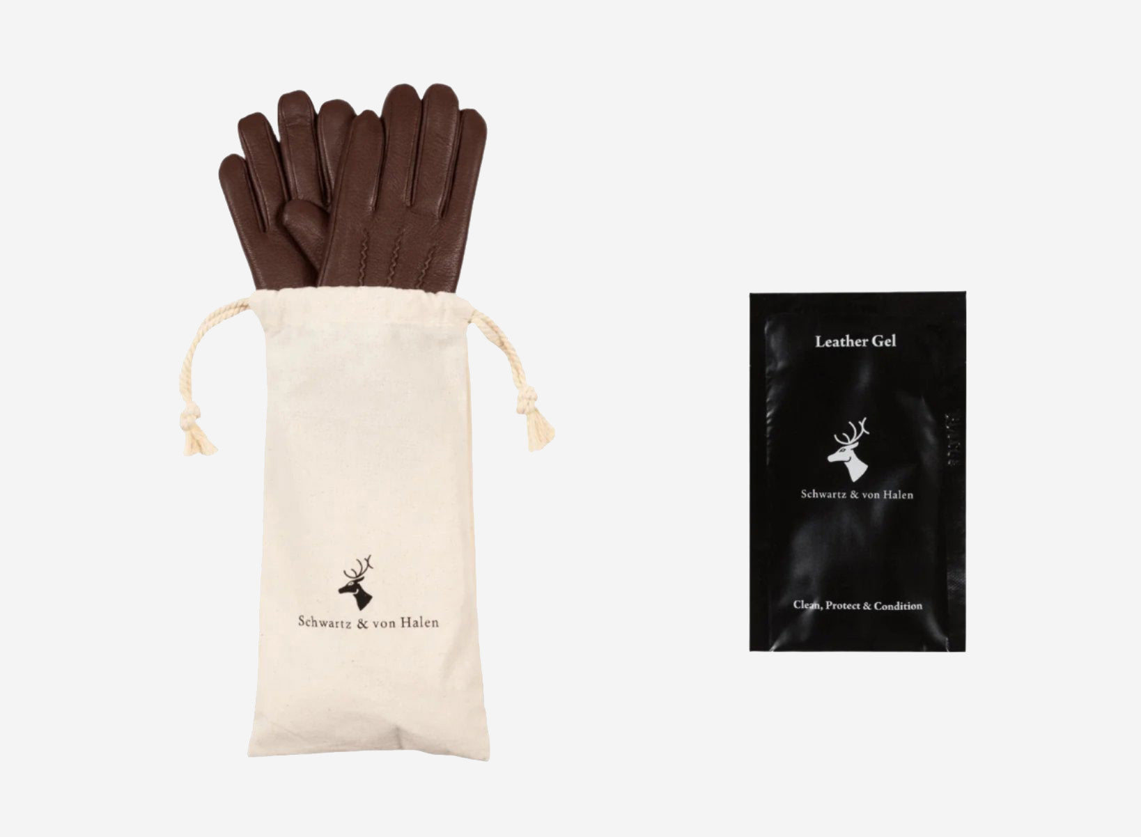 Alle Handschuhen von Schwartz & von Halen werden mit einem luxuriösen Baumwollbeutel und einem eigens entwickeltem Ledergel geliefert, wodurch ein Paar Handschuhe sich perfekt als Geschenk eignen.