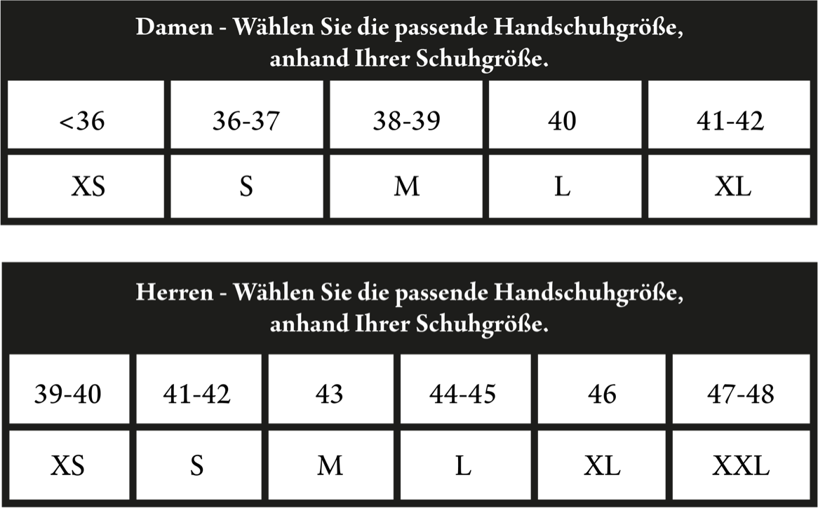 Sollte sich später herausstellen, dass die gewählte Größe doch zu groß oder zu klein ist, können Sie die Handschuhe kostenlos gegen eine andere Größe umtauschen. Lesen Sie hier, wie Sie die Handschuhe kostenlos umtauschen können.